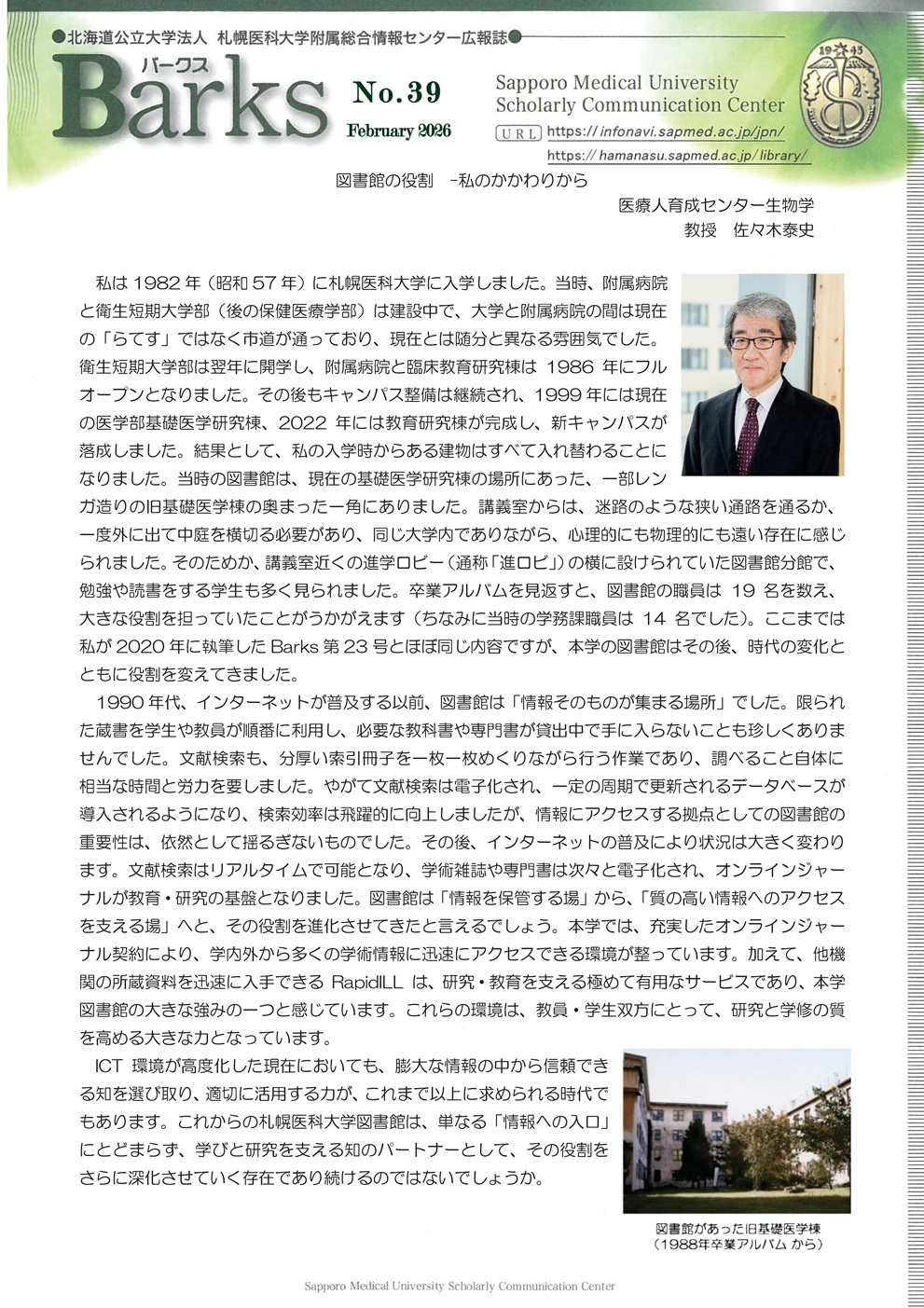 当センター広報誌である「Barks」を次の通り発行いたしました。 どうぞご一読ください。 1 発行誌 Barks(バークス)No.39 2 発行日 2026年2月10日 3 当センターホームページコンテンツ 「Barks メールマガジン/広報誌(アイコン)」→「広報誌Barks」 今回の巻頭言は、医療人育成センター 生物学 佐々木 泰史 教授にご執筆いただきました。 ぜひ、ご覧ください。 タグ お知らせ